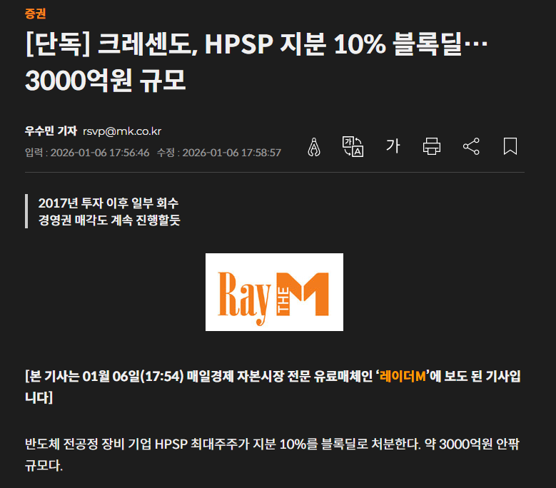 [단독] 크레센도, HPSP 지분 10% 블록딜…3000억원 규모 - 매일경제